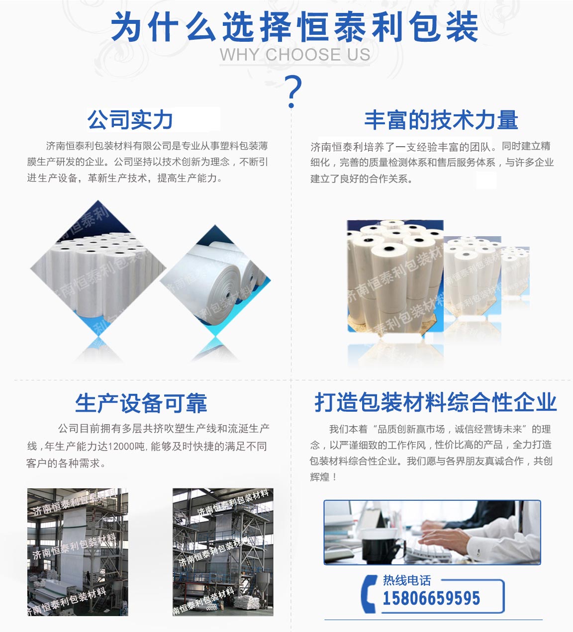 濟(jì)南恒泰利包裝材料有限公司位于濟(jì)南市市中區(qū),是從事塑料包裝薄膜生產(chǎn)研發(fā)的企業(yè)。公司成立十幾年以來,堅持以技術(shù)創(chuàng)新為理念,不斷引進(jìn)生產(chǎn)設(shè)備,革新生產(chǎn)技術(shù),提高生產(chǎn)能力。并堅持自主創(chuàng)新,加強(qiáng)企業(yè)管理,培養(yǎng)了一支經(jīng)驗豐富的團(tuán)隊。同時企業(yè)建立高標(biāo)準(zhǔn)、精細(xì)化質(zhì)量檢測管理體系和完善的售后服務(wù)體系,與國內(nèi)外許多家企業(yè)建立了良好密切的合作關(guān)系。公司目前擁有多層共擠吹塑生產(chǎn)線和流延生產(chǎn)線,年生產(chǎn)能力達(dá)12000噸,能夠及時快捷的滿...